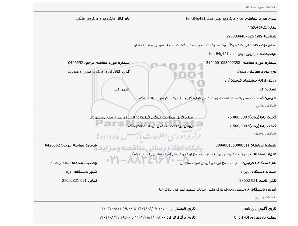 مزایده مایکروویو بوش مدل hmt84g421, مزایده، مایکروویو بوش مدل hmt84g421