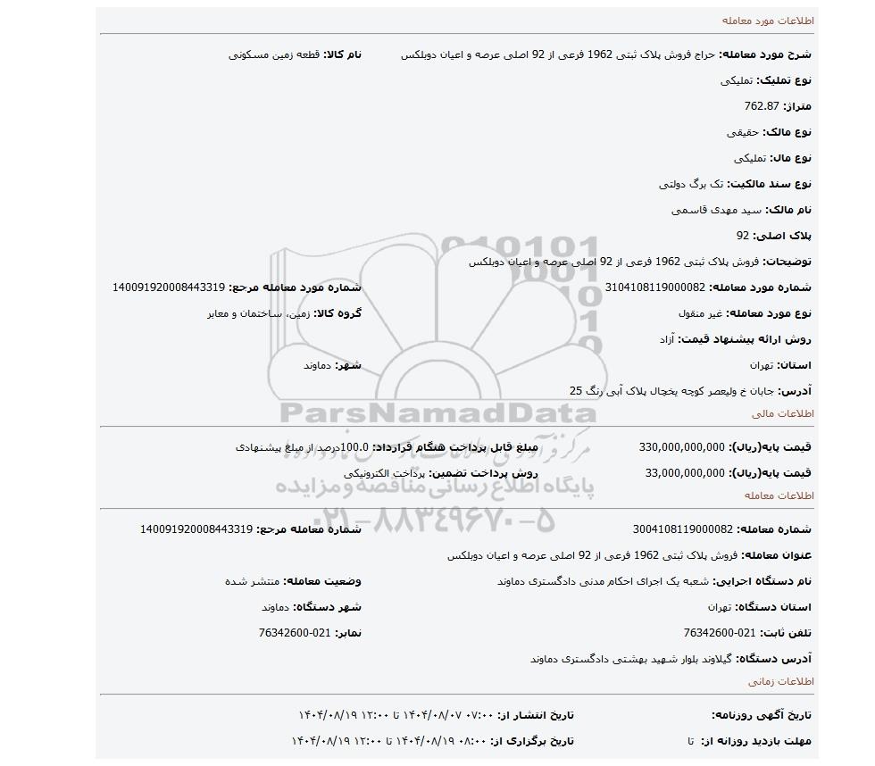 | شرح مورد معامله: حراج فروش پلاک ثبتی 1962 فرعی از 92 اصلی عرصه و اعیان دوبلکس | نام کالا: قطعه زمین مسکونی | |