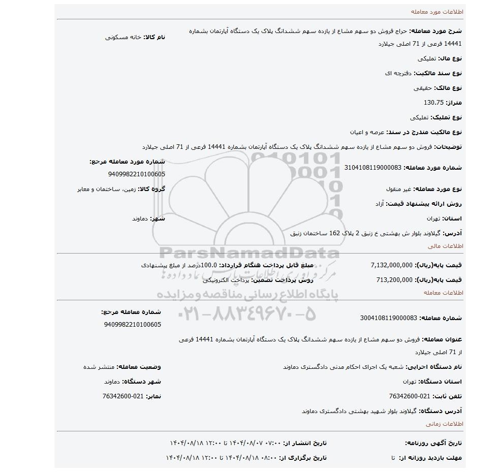 | شرح مورد معامله: حراج فروش دو سهم مشاع از یازده سهم ششدانگ پلاک یک دستگاه آپارتمان بشماره 14441 فرعی از 71 اصلی جیلارد | نام کالا: خانه مسکونی | |