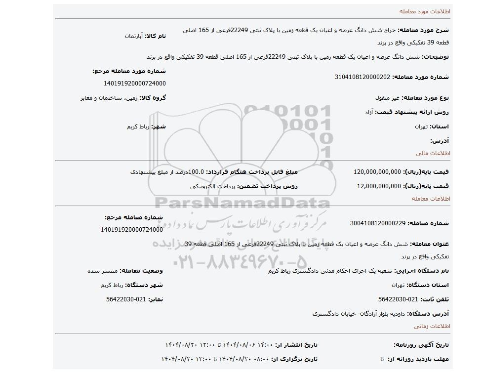 | شماره مورد معامله: 3104108120000202 | شماره مورد معامله مرجع: 140191920000724000 | |