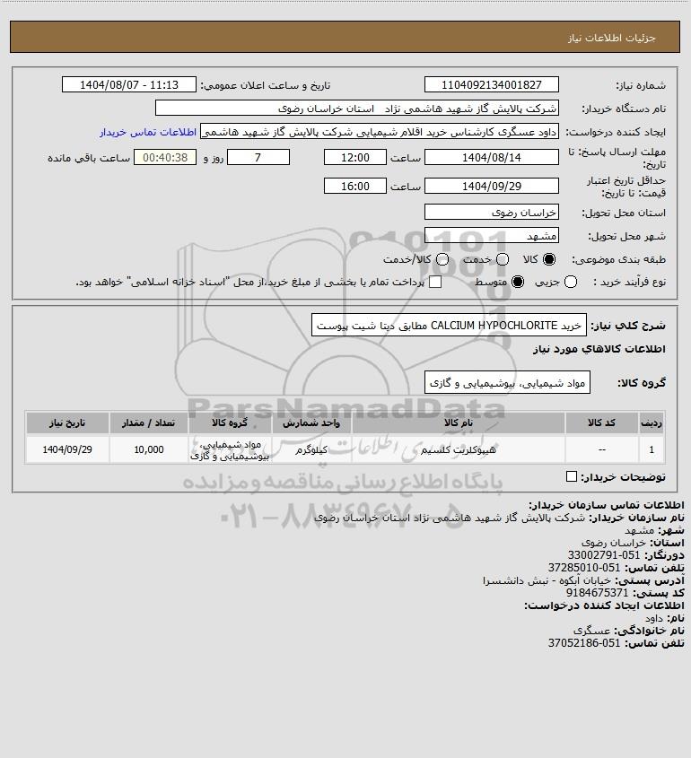 شرح کلی نیاز: خرید CALCIUM HYPOCHLORITE مطابق دیتا شیت پیوست