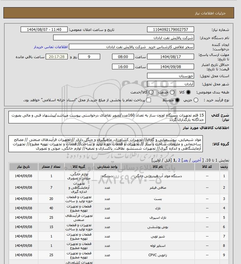 شرح کلی نیاز: 15 قلم تجهیزات دستگاه اوزون ساز به تعداد 160عدد/تصویر تقاضای درخواستی پیوست میباشد/پیشنهاد فنی و مالی بصورت جداگانه بارگذاری گردد