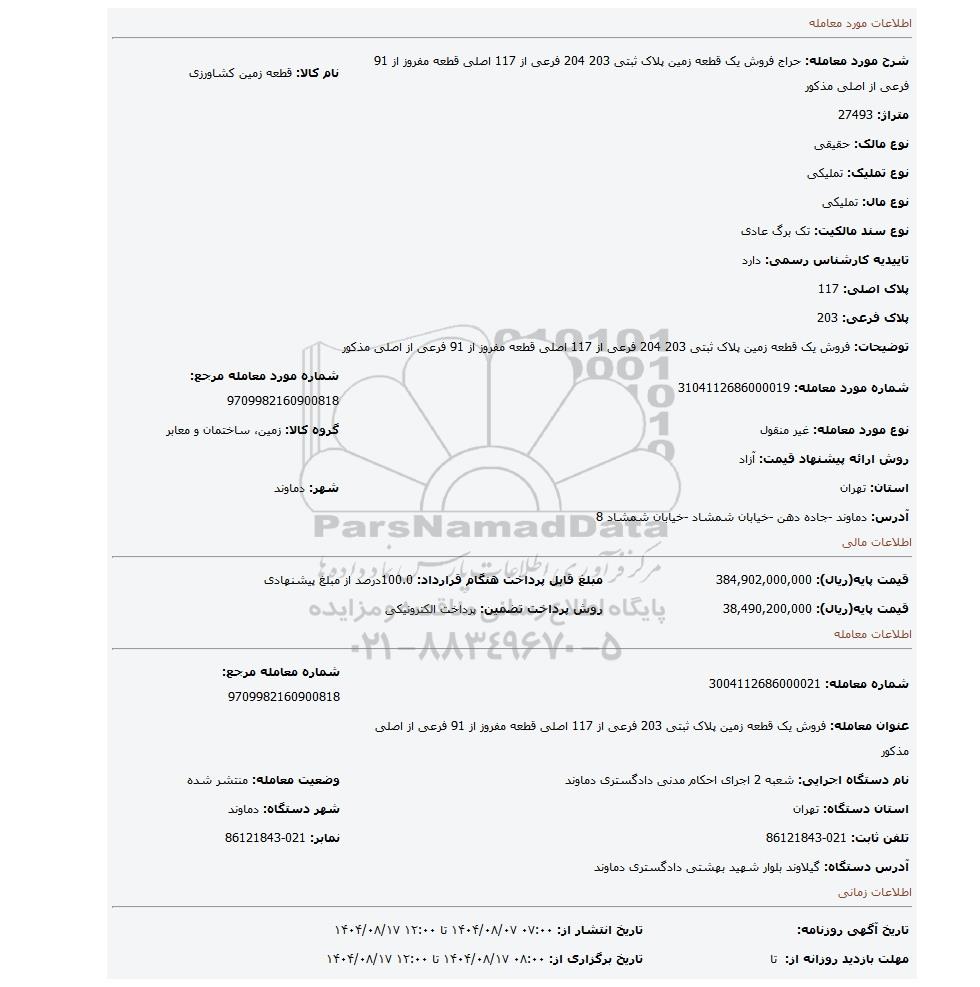 | شماره مورد معامله: 3104112686000019 | شماره مورد معامله مرجع: 9709982160900818 | |