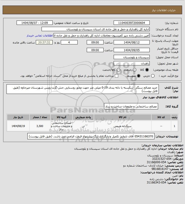 شرح کلی نیاز: خرید مصالح سنگی شکسته با دانه بندی 19-0 میلی متر جهت محور روستایی جش-گزند-روپس شهرستان میرجاوه (طبق فایل پیوست)