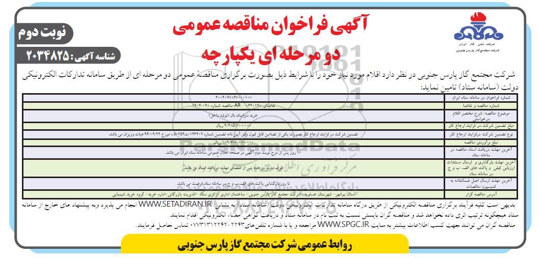 شرکت مجتمع گاز پارس جنوبی در نظر دارد اقلام مورد نیاز خود را با شرایط ذیل بصورت برگزاری مناقصه عمومی دو مرحله ای از طریق سامانه تدارکات الکترونیکی دولت (سامانه ستاد) تامین نماید:
