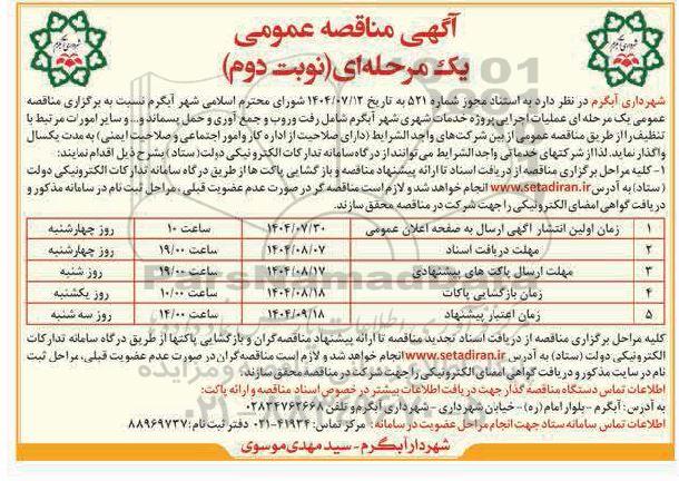 شهرداری آبگرم در نظر دارد به استناد مجوز شماره 521 به تاریخ 1404.07.12 شورای محترم اسلامی شهر آبگرم نسبت به برگزاری مناقصه عمومی یک مرحله ای عملیات اجرایی پروژه خدمات شهری شهر آبگرم شامل رفت و روب و جمع آوری و حمل پسماند و.... و سایر امورات مرتبط با تنظیف را از طریق مناقصه عمومی از بین شرکتهای واجد الشرایط (دارای صلاحیت از اداره کار و امور اجتماعی و صلاحیت ایمنی) به مدت یکسال واگذار نماید. لذا از شرکتهای خدماتی واجد الشرایط می توانند از درگاه سامانه تدارکات الکترونیکی دولت (ستاد) بشرح ذیل اقدام نمایند: