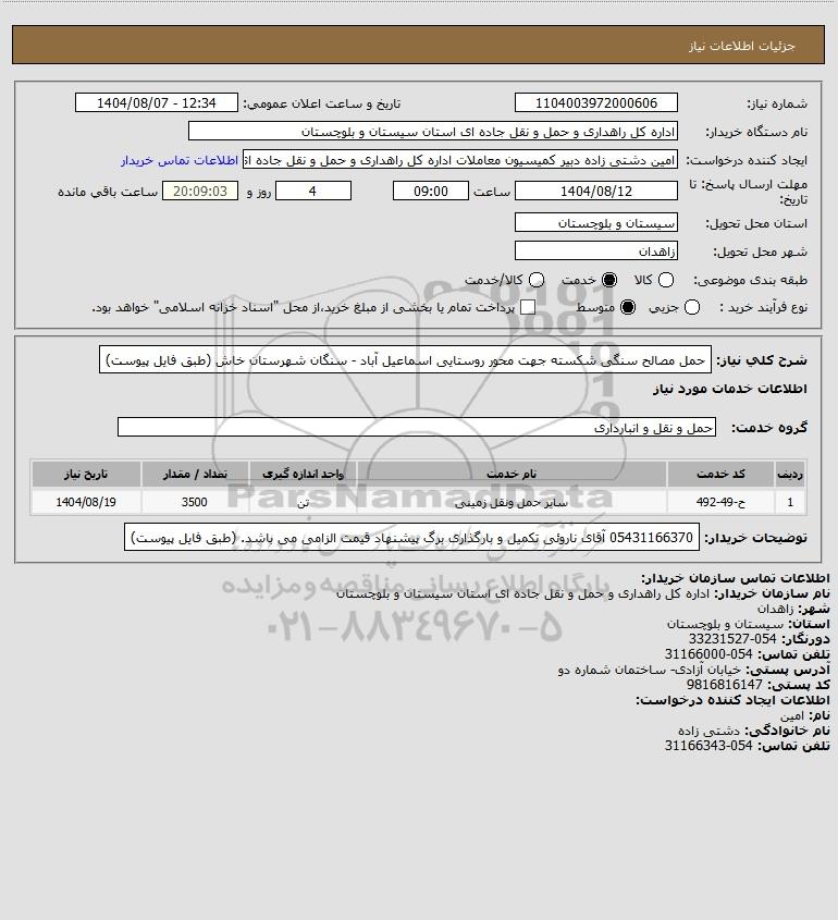 شرح کلی نیاز: حمل مصالح سنگی شکسته جهت محور روستایی اسماعیل آباد - سنگان شهرستان خاش (طبق فایل پیوست)