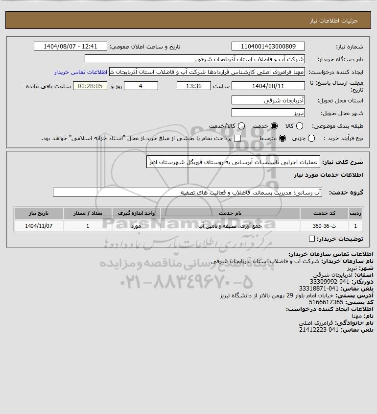 شرح کلی نیاز: عملیات اجرایی تاسیسات آبرسانی به روستای قوریگل شهرستان اهر