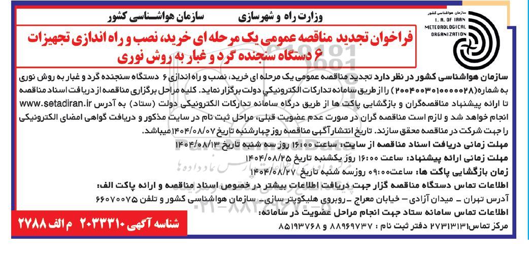 سازمان هواشناسی کشور در نظر دارد مناقصه عمومی یک مرحله ای خرید، نصب و راه اندازی 6 دستگاه سنجنده گردوغبار به روش نوری به شماره 2004003010000028 را از طریق سامانه تدارکات الکترونیکی دولت برگزار نماید. کلیه مراحل برگزاری مناقصه از دریافت اسناد مناقصه تا ارائه پیشنهاد مناقصه گران و بازگشایی پاکتها از طریق درگاه سامانه تدارکات الکترونیکی دولت (ستاد) به آدرس ستاد ایران انجام خواهد شد و لازم است مناقصه گران در صورت عدم عضویت قبلی مراحل ثبت نام در سایت مذکور و دریافت گواهی امضای الکترونیکی را جهت شرکت در مناقصه محقق سازند. تاریخ انتشار آگهی مناقصه روز 4شنبه تاریخ 1404.08.7 می باشد.