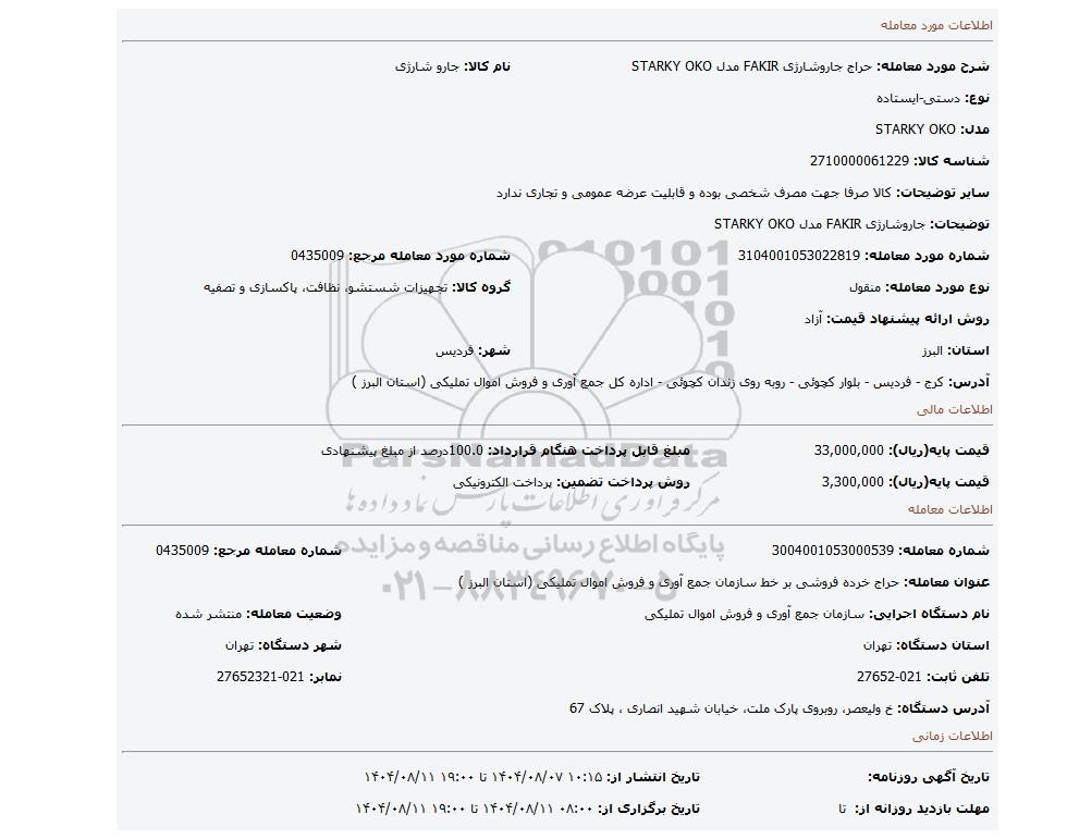 مزایده عمومی مزایده جاروشارژی FAKIR مدل STARKY OKO برگزار میگردد. از کلیه افراد متخصص و شرکت‌های واجد شرایط دعوت به عمل می‌آید تا در این مزایده با کد خبرگزاری پارس نماد : 9771907 شرکت نمایند تاریخ شروع مزایده : 1404/08/07 مهلت شرکت در مزایده: تا پایان روز 1404/08/11 مکان برگزاری اموال واگذاری استان‌های البرز و دسته‌بندی‌های مربوط به این حراجی متفرقه میباشد. اطلاعات دقیق‌تر درباره شرایط شرکت در مزایده آنلاین و نحوه ارسال مدارک، الزامات پروژه و دریافت اسناد مزایده و تاریخ بازگشایی پاکت‌ها، در بخش اطلاعات تکمیلی این آگهی درج شده است.