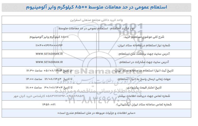 استعلام عمومی در حد معاملات متوسط 8500 کیلوگرم وایر آلومینیوم