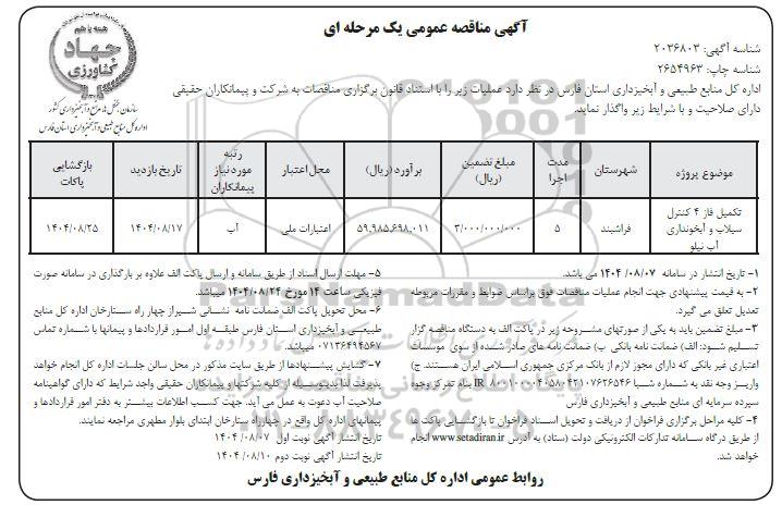 | تکمیل فاز 4 کنترل سیلاب و آبخونداری آب نیلو | فراشبند | 5 | 3.000.000.000 | 59.985.698.011 | اعتبارات ملی | آب | 1404.8.17 | 1404.8.25 |