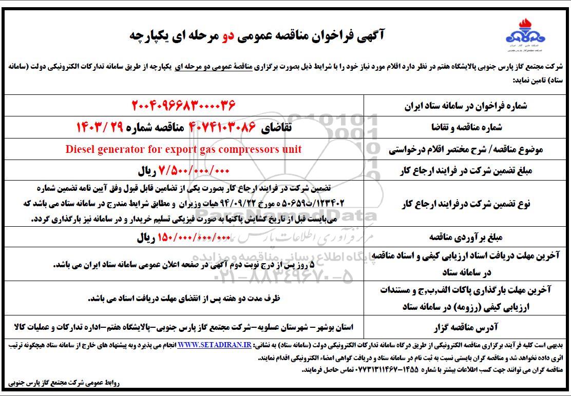 مناقصه disel generator for export gas compressors unit- از کلیه افراد متخصص و شرکتها واجد شرایط دعوت به عمل میآید در مناقصه با کد خبرگزاری پارس نماد: 9772281 شرکت نمایند.