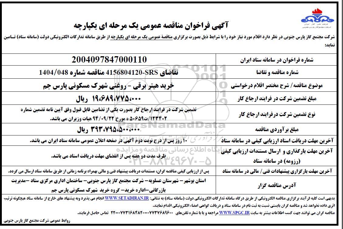 شرکت مجتمع گاز پارس جنوبی در نظر دارد اقلام مورد نیاز خود را با شرایط ذیل بصورت برگزاری مناقصه عمومی یک مرحله ای از طریق سامانه تدارکات الکترونیکی دولت سامانه ستاد تامین نماید