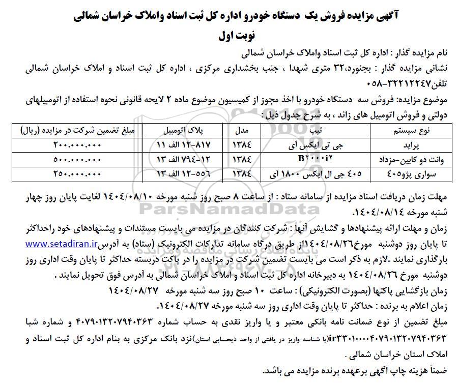 آگهی مزایده فروش یک دستگاه خودرو اداره کل ثبت اسناد و املاک خراسان شمالی نوبت اول ؟
