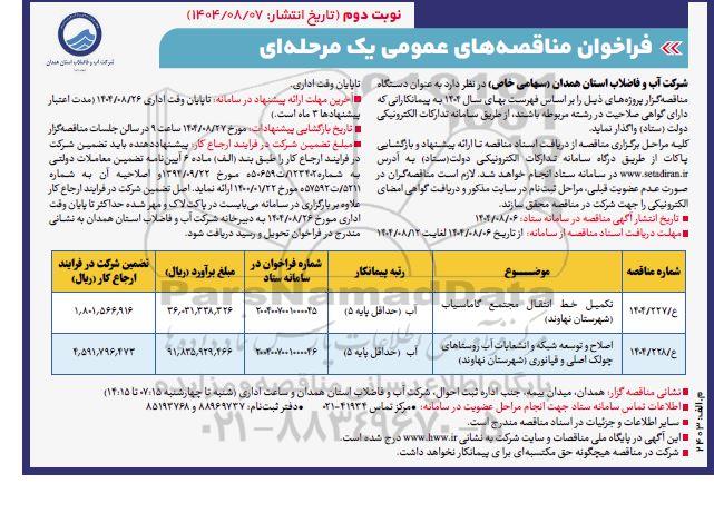 شرکت آب و فاضلاب استان همدان (سهامی خاص) در نظر دارد به عنوان دستگاه مناقصه گزار پروژه های ذیل را بر اساس فهرست بهای سال 1404 به پیمانکارانی که دارای گواهی صلاحیت در رشته مربوطه باشند، از طریق سامانه تدارکات الکترونیکی دولت (ستاد) واگذار نماید.