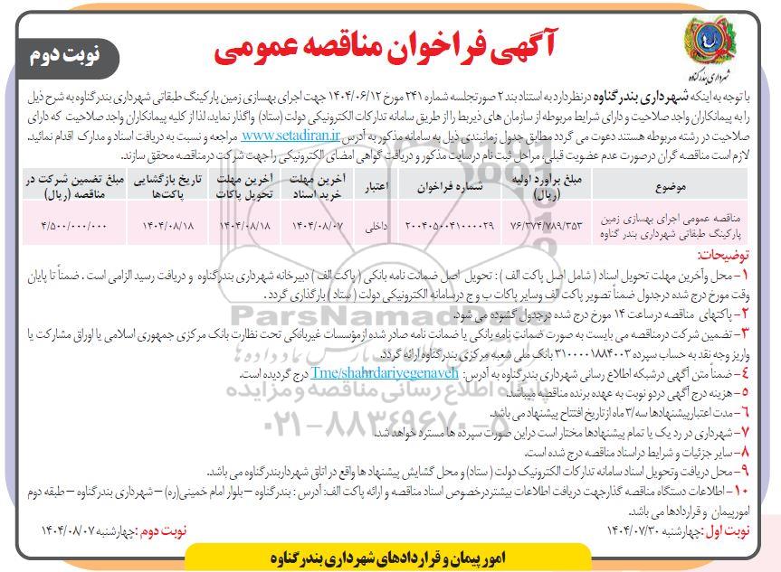 با توجه به اینکه شهرداری بندر گناوه در نظر دارد به استناد بند 2 صورتجلسه شماره 241 مورخ 1404.6.12 جهت اجرای بهسازی زمین پارکینگ طبقاتی شهرداری بندر گناوه به شرح ذیل را به پیمانکاران واجد صلاحیت و دارای شرایط مربوطه از سازمانهای ذیربط را از طریق سامانه تدارکات الکترونیکی دولت (ستاد) واگذار نماید لذا از کلیه پیمانکاران واجد صلاحیت که دارای صلاحیت در رشته مربوطه هستند دعوت میگردد مطابق جدول زمانبندی ذیل به سامانه مذکور به آدرس ستاد ایران مراجعه و نسبت به دریافت اسناد و مدارک اقدام نمایید. لازم است مناقصه گران در صورت عدم عضویت قبلی مراحل ثبت نام در سایت مذکور و دریافت گواهی امضای الکترونیکی را جهت شرکت در مناقصه محقق سازند.