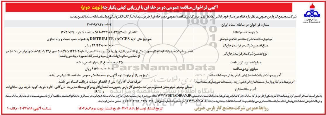 شرکت مجتمع گاز پارس جنوبی در نظر دارد اقلام مورد نیاز خود را با شرایط ذیل بصورت برگزاری مناقصه عمومی دو مرحله ای از طریق سامانه تدارکات الکترونیکی دولت (سامانه ستاد) تامین نماید