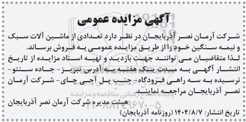 شرکت آرمان نصر آذربایجان در نظر دارد تعدادی از ماشین آلات سبک و نیمه سنگین خود را از طریق مزایده عمومی به فروش برساند.