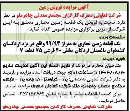 شرکت تعاونی مصرف کارگران مجتمع معدنی چادرملو در نظر دارد نسبت به فروش یک قطعه زمین تجاری متعلق به این شرکت از طریق برگزاری مزایده عمومی اقدام نماید.
