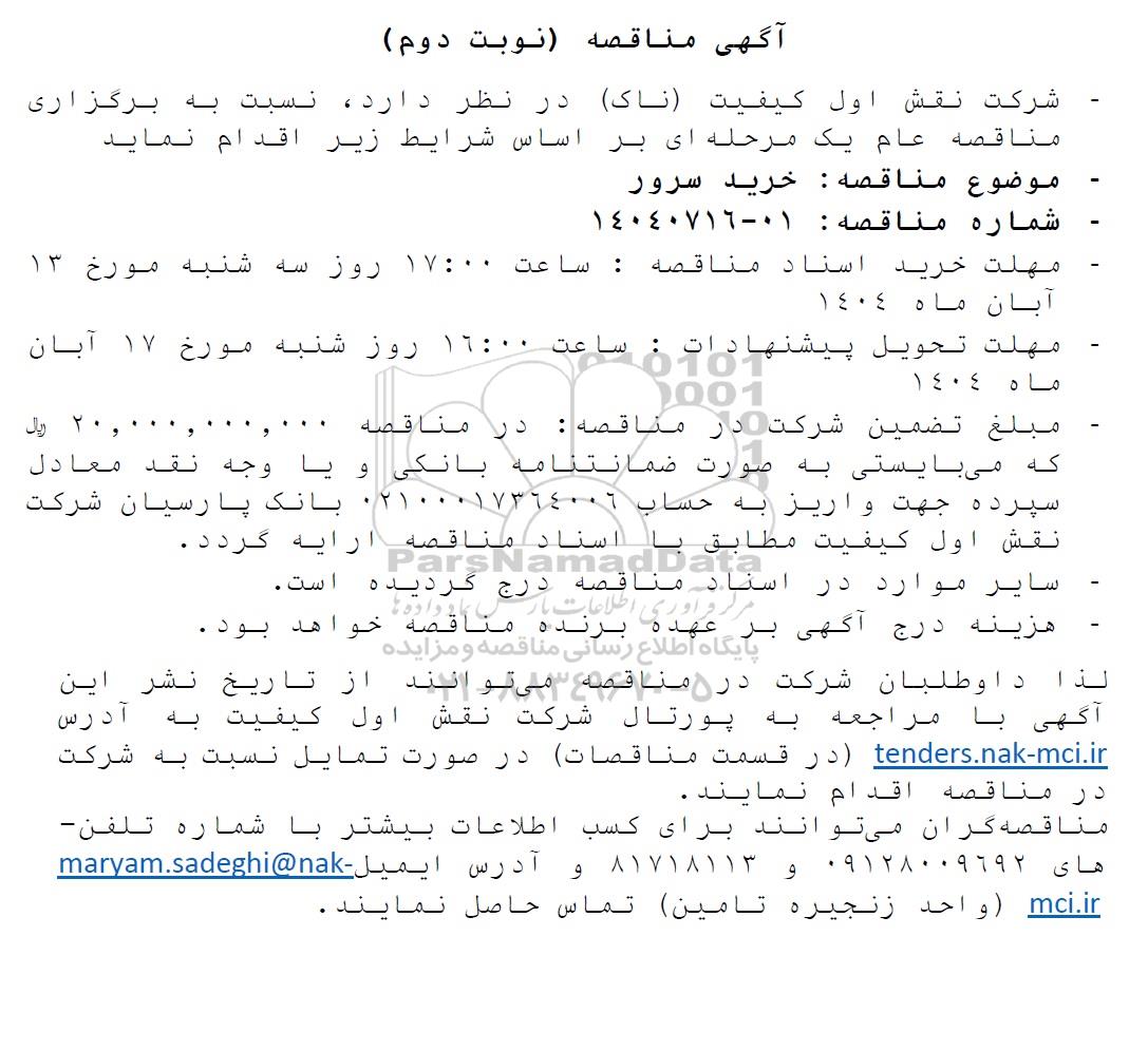 مناقصه گران می توانند برای کسب اطلاعات بیشتر با شماره تلفن های 09128009692 و 81718113 و آدرس ایمیلmaryam.sadeghi@nak-mci.ir (واحد زنجیره تامین) تماس حاصل نمایند.