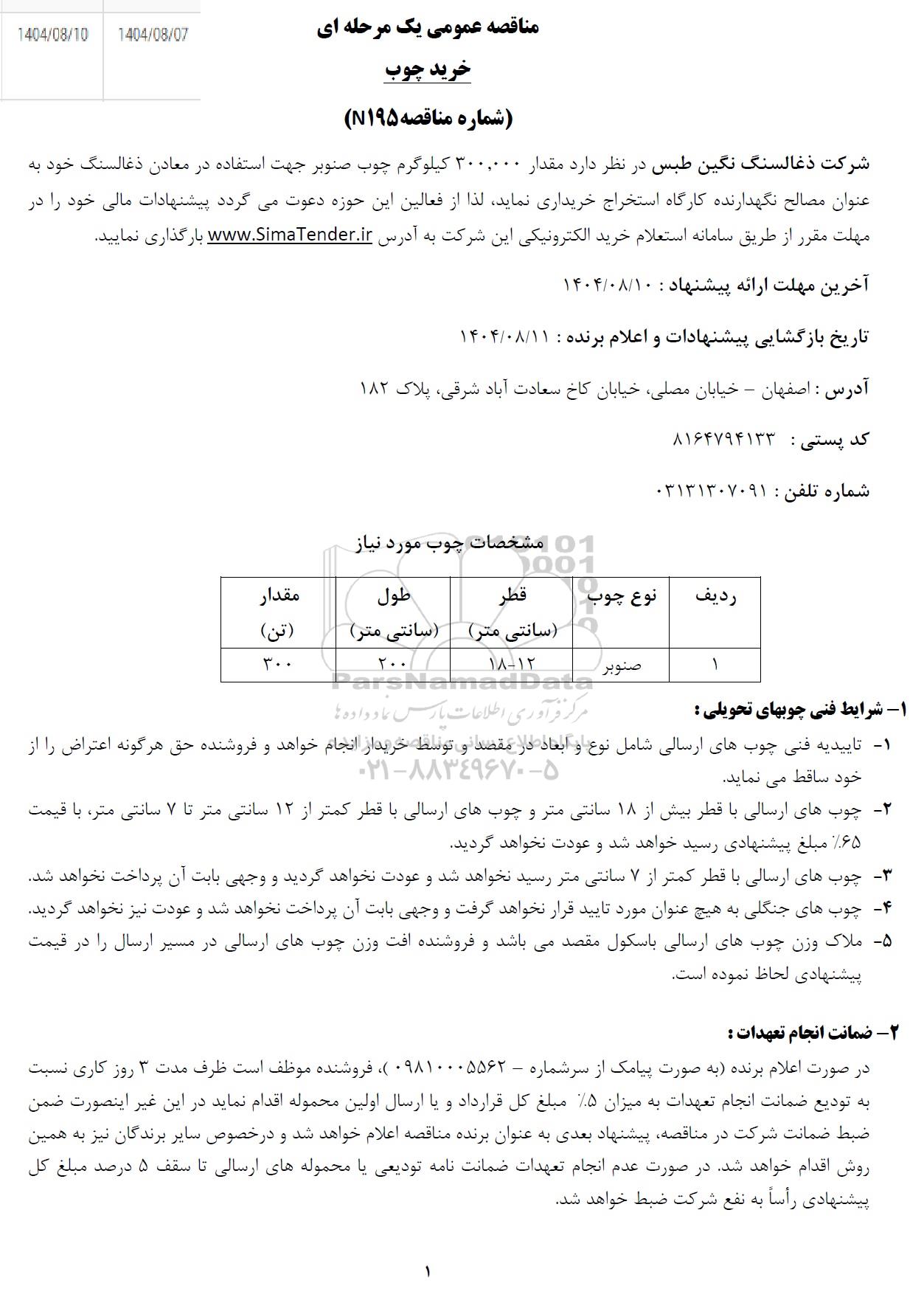 شرکت ذغالسنگ نگین طبس در نظر دارد مقدار 300.000 کیلوگرم چوب صنوبر جهت استفاده در معادن ذغالسنگ خود به عنوان مصالح نگهدارنده کارگاه استخراج خریداری نماید. لذا از فعالین این حوزه دعوت میگردد پیشنهادات مالی خود را در مهلت مقرر از طریق سامانه استعلام خرید الکترونیکی این شرکت به ادرس سیما تندر بارگزاری نمایید.