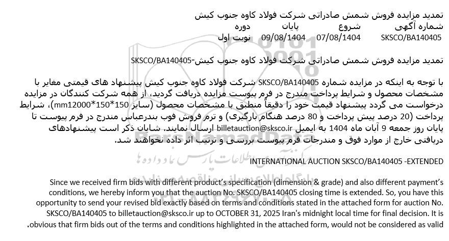 Since we received firm bids with different product’s specification (dimension & grade) and also different payment’s conditions, we hereby inform you that the auction No. SKSCO/BA140405 closing time is extended. So, you have this opportunity to send your revised bid exactly based on terms and conditions stated in the attached form for auction No. SKSCO/BA140405 to billetauction@sksco.ir up to OCTOBER 31, 2025 Iran's midnight local time for final decision. It is obvious that firm bids out of the terms and conditions highlighted in the attached form, would not be considered as valid.