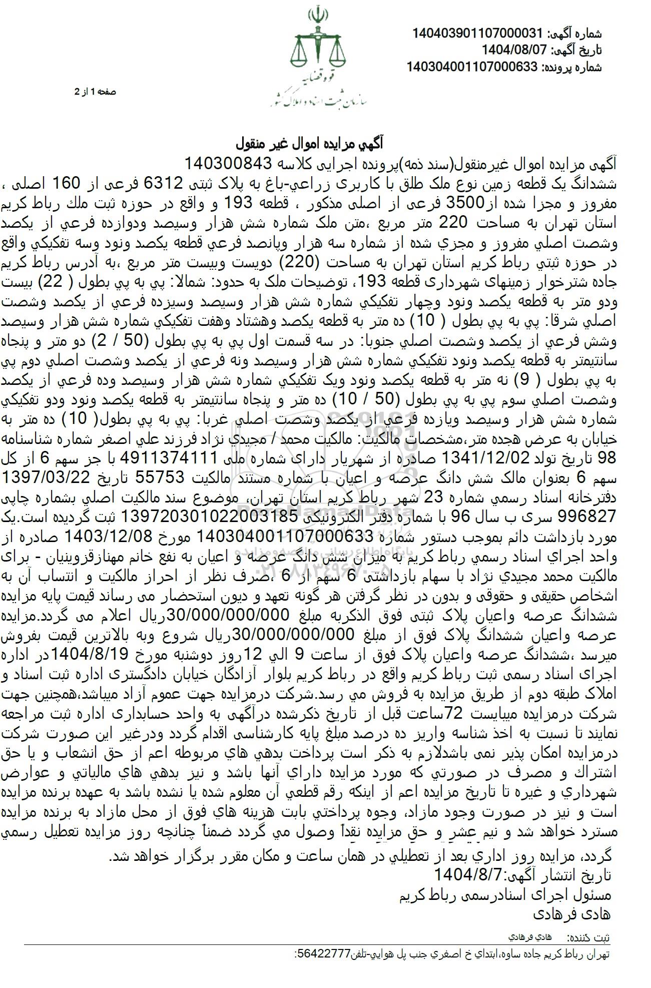 آگهی مزایده اموال غیر منقول سند ذمه پرونده اجرایی کلاسه 140300843 ششدانگ یک قطعه زمین نوع ملک طلق با کاربری زراعی باغ به پلاک ثبتی 6312 فرعی از 160 اصلی ، مفروز و مجزا شده از 3500 فرعی از اصلى مذكور ، قطعه 193 و واقع در حوزه ثبت ملك رباط كريم استان تهران به مساحت 220 متر مربع متن، ملک شماره شش هزار و سیصد و دوازده فرعی از یکصد وشصت اصلي مفروز و مجزي شده از شماره سه هزار و پانصد فرعي قطعه يكصد و نود و سه تفكيكي واقع در حوزه ثبتي رباط كريم استان تهران به مساحت (220) دویست و بیست متر مربع به آدرس رباط کریم جاده شتر خوار زمینهای شهرداری قطعه 193 توضیحات ملک به حدود شمالا پي به پي بطول (22) بيست و دو متر به قطعه یکصد و نود و چهار تفكيكي شماره شش هزار و سیصد و سیزده فرعی از یکصد و شصت اصلي شرقا پي به پي بطول ( 10 ) ده متر به قطعه یکصد و هشتاد و هفت تفكيكي شماره شش هزار و سیصد وشش فرعی از یکصد و شصت اصلي جنوبا در سه قسمت اول پي به بي بطول (50 . 2) دو متر و پنجاه سانتیمتر به قطعه يكصد ونود تفكيكي شماره شش هزار وسيصد ونه فرعی از یکصد و شصت اصلي دوم بي به پي بطول (9) نه متر به قطعه یکصد و نود و یک تفکیکی شماره شش هزار و سیصد و ده فرعی از یکصد وشصت اصلي سوم پي به پي بطول (50. 10) ده متر و پنجاه سانتیمتر به قطعه یکصد و نود ودو تفكيكي شماره شش هزار و سیصد و یازده فرعی از یکصد و شصت اصلي غربا پي به پي بطول ( 10 ) ده متر به خیابان به عرض هجده متر مشخصات مالکيت مالکيت محمد . مجيدي نژاد فرزند علي اصغر شماره شناسنامه 98 تاریخ تولد 1341.12.02 صادره از شهریار دارای شماره ملی 4911374111 با جز سهم 6 از کل سهم 6 بعنوان مالک شش دانگ عرصه و اعیان با شماره مستند مالکیت 55753 تاريخ 1397.03.22 دفترخانه اسناد رسمی شماره 23 شهر رباط کریم استان تهران موضوع سند مالکیت اصلی بشماره چاپی 996827 سری ب سال 96 با شماره دفتر الکترونیکی 139720301022003185 ثبت گردیده است. یک مورد بازداشت دائم بموجب دستور شماره 140304001107000633 مورخ 1403.12.08 صادره از واحد اجراي اسناد رسمي رباط کریم به میزان شش دانگ عرصه و اعیان به نفع خانم مهناز قزوینیان - برای مالکیت محمد مجيدي نژاد با سهام بازداشتی 6 سهم از 6 ، صرف نظر از احراز مالکیت و انتساب آن به اشخاص حقیقی و حقوقی و بدون در نظر گرفتن هر گونه تعهد و دیون استحضار میرساند قیمت پایه مزایده ششدانگ عرصه و اعیان پلاک ثبتی فوق الذكريه مبلغ 30.000.000.000 ريال اعلام می گردد. مزایده عرصه و اعیان ششدانگ پلاک فوق از مبلغ 30.000.000.000 ريال شروع و به بالاترین قیمت بفروش میرسد ، ششدانگ عرصه و اعیان پلاک فوق از ساعت 9 الی 12 روز دوشنبه مورخ 1404.8.19 در اداره اجرای اسناد رسمی ثبت رباط کریم واقع در رباط کریم بلوار آزادگان خیابان دادگستری اداره ثبت اسناد و املاک طبقه دوم از طریق مزایده به فروش می رسد. شرکت در مزایده جهت عموم آزاد میباشد، همچنین جهت شرکت در مزایده میبایست 72 ساعت قبل از تاریخ ذکر شده در آگهی به واحد حسابداری اداره ثبت مراجعه نمایند تا نسبت به اخذ شناسه واریز ده درصد مبلغ پایه کارشناسی اقدام گردد و در غیر این صورت شرکت در مزایده امکان پذیر نمی باشد لازم به ذکر است پرداخت بدهي هاي مربوطه اعم از حق انشعاب و یا حق اشتراك و مصرف در صورتی که مورد مزایده داراي آنها باشد و نیز بدهي هاي مالياتي و عوارض شهرداری و غیره تا تاریخ مزایده اعم از اینکه رقم قطعي آن معلوم شده یا نشده باشد به عهده برنده مزایده است و نیز در صورت وجود مازاد وجوه پرداختی بابت هزينه هاي فوق از محل مازاد به برنده مزایده مسترد خواهد شد و نیم عشر و حق مزایده نقداً وصول مي گردد ضمنا چنانچه روز مزایده تعطیل رسمي گردد، مزایده روز اداری بعد از تعطیلی در همان ساعت و مکان مقرر برگزار خواهد شد.
