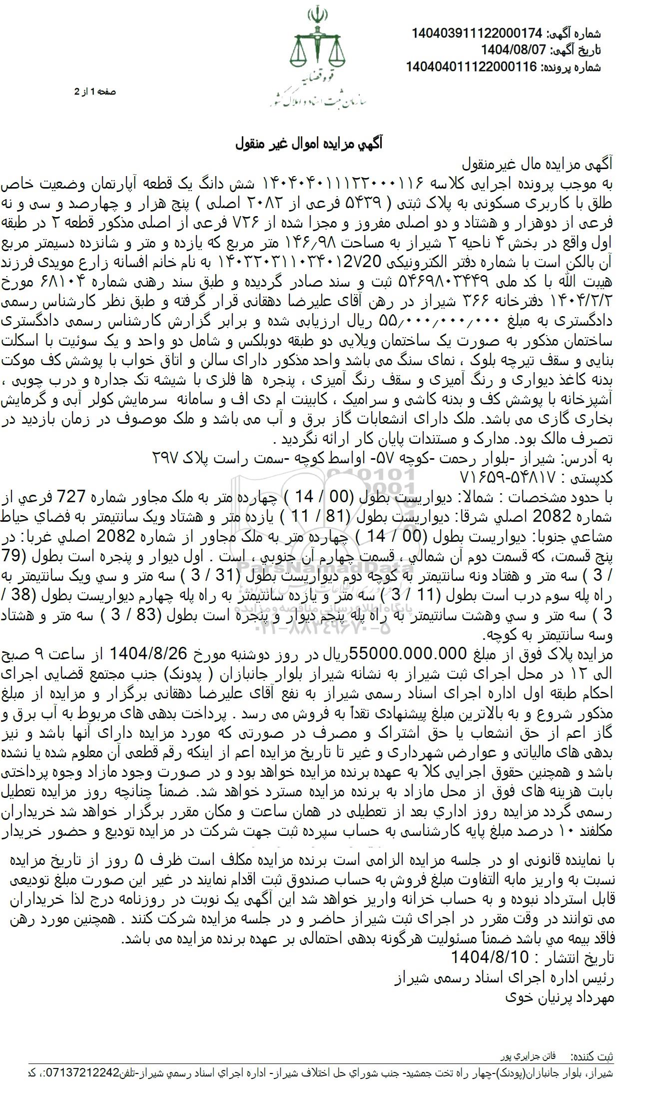 به موجب پرونده اجرایی کلاسه 140404011133000116 شش دانگ یک قطعه آپارتمان وضعیت خاص طلق با کاربری مسکونی به پلاک ثبتی ( 5439 فرعی از 2083 اصلی ( پنج هزار و چهارصد و سی و نه فرعی از دوهزار و هشتاد و دو اصلی مقرور و مجزا شده از 726 فرعی از اصلی مذکور قطعه 2 در طبقه اول واقع در بخش 4 ناحیه 2 شیراز به مساحت 146/98 متر مربع که یازده و متر و شانزده دسیمتر مربع آن بالکن است با شماره دفتر الکترونیکی 140320311034017720 به نام خانم افسانه زارع مویدی فرزند هيبت الله با کد ملی 5469803449 ثبت و سند صادر گردیده و طبق سند رهنی شماره 68104 مورخ 1404.3.2 دفترخانه 366 شیراز در رهن آقای علیرضا دهقانی قرار گرفته و طبق نظر کارشناس رسمی دادگستری به مبلغ 55.000.000.000 ریال ارزیابی شده و برابر گزارش کارشناس رسمی دادگستری ساختمان مذکور به صورت یک ساختمان ویلایی دو طبقه دوبلکس و شامل دو واحد و یک سوئیت با اسکلت بنایی و سقف تیرچه بلوک ، نمای سنگ می باشد واحد مذکور دارای سالن و اتاق خواب با پوشش کف موکت بدنه کاغذ دیواری و رنگ آمیزی و سقف رنگ آمیزی پنجره ها فلزی با شیشه تک جداره و درب چوبی . آشپزخانه با پوشش کف و بدنه کاشی و سرامیک ، کابینت ام دی اف و سامانه سرمایش کولر آبی و گرمایش بخاری گازی میباشد ملک دارای انشعابات گار برق و آب میباشد و ملک موصوف در زمان بازدید در تصرف مالک بود مدارک و مستندات پایان کار ارائه نگردید .