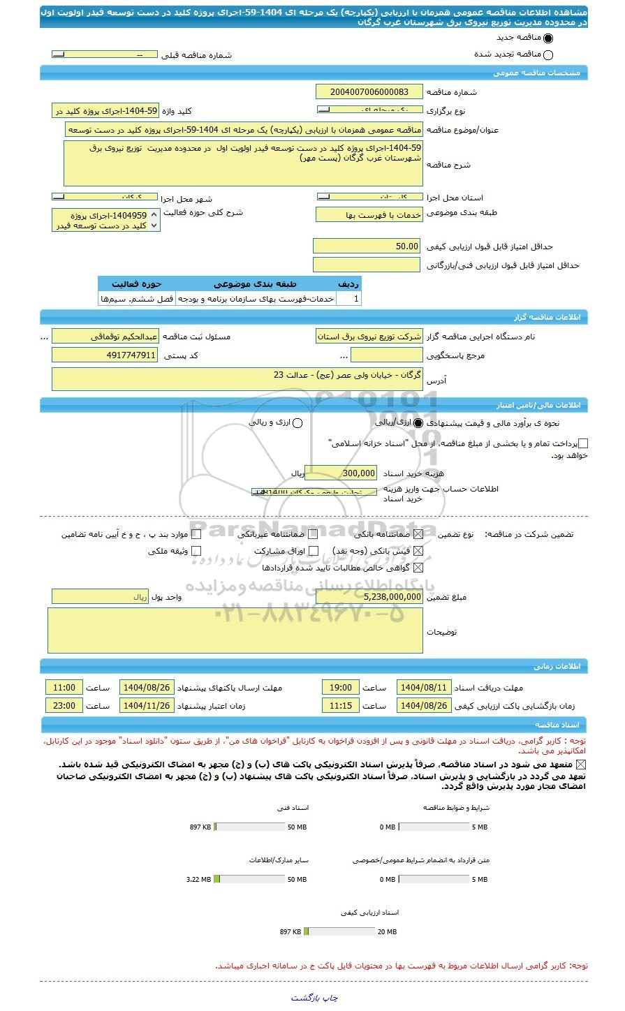 زمان بازگشایی پاکت ها1404/08/26تا تاریخ11:15زمان اعتبار پیشنهاد1404/11/26تا ساعت23:00