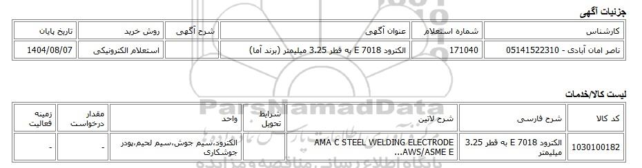 | ناصر امان آبادی - 05141522310 | 171040 | الکترود E 7018 به قطر 3.25 میلیمتر (برند آما) | استعلام الکترونیکی | 1404/08/07 |
