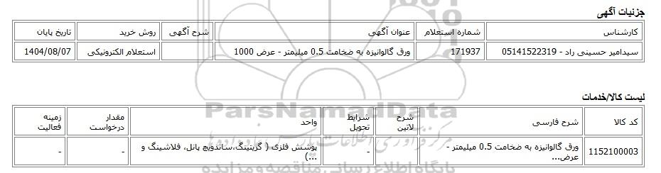 | سیدامیر حسینی راد - 05141522319 | 171937 | ورق گالوانیزه به ضخامت 0.5 میلیمتر - عرض 1000 | استعلام الکترونیکی | 1404/08/07 |