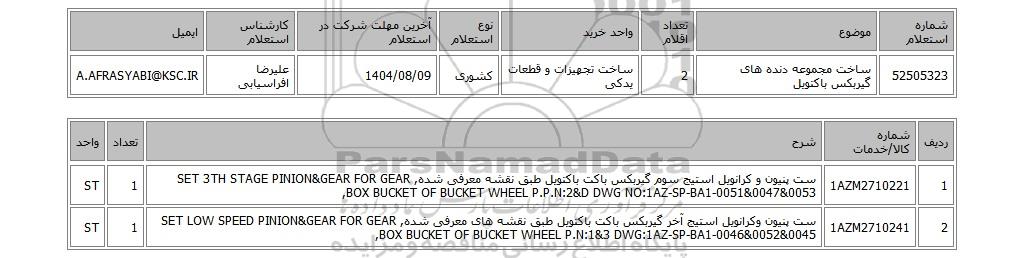 | 52505323 | ساخت مجموعه دنده های گیربکس باکتویل | 2 | ساخت تجهیزات و قطعات یدکی | کشوری | 1404/08/09 | علیرضا افراسیابی | A.AFRASYABI@KSC.IR |
