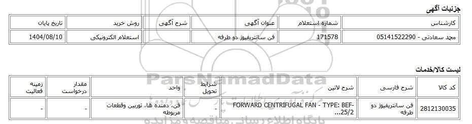 | محمد سعادتی - 05141522290 | 171578 | فن سانتریفیوژ دو طرفه | استعلام الکترونیکی | 1404/08/10 |