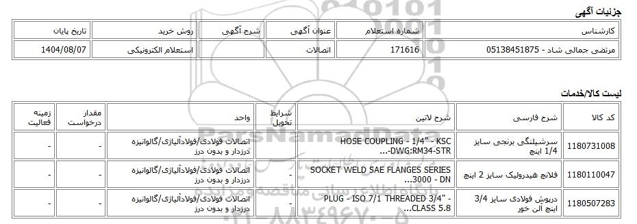 4 استعلام الکترونیکی بست فلزی شیلنگ 9773798 1404/08/08 new special not payed خراسان رضوی