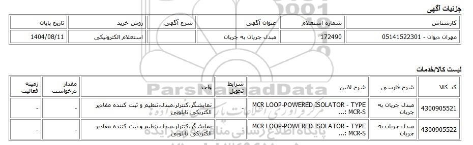 | مهران دیوان - 05141522301 | 172490 | مبدل جریان به جریان | استعلام الکترونیکی | 1404/08/11 |