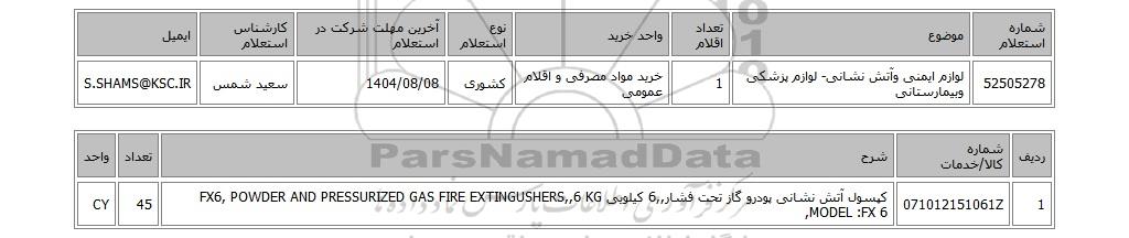 | 52505278 | لوازم ایمنی وآتش نشانی- لوازم پزشکی وبیمارستانی | 1 | خرید مواد مصرفی و اقلام عمومی | کشوری | 1404/08/08 | سعید شمس | S.SHAMS@KSC.IR |