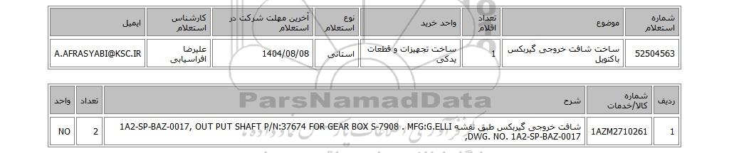 | 52504563 | ساخت شافت خروجی گیربکس باکتویل | 1 | ساخت تجهیزات و قطعات یدکی | استانی | 1404/08/08 | علیرضا افراسیابی | A.AFRASYABI@KSC.IR |
