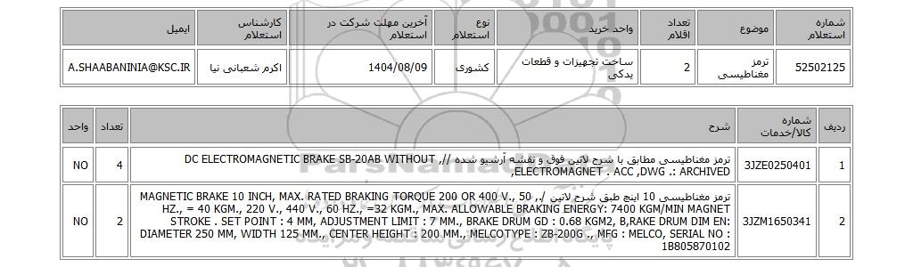 | 52502125 | ترمز مغناطیسی | 2 | ساخت تجهیزات و قطعات یدکی | کشوری | 1404/08/09 | اکرم شعبانی نیا | A.SHAABANINIA@KSC.IR |