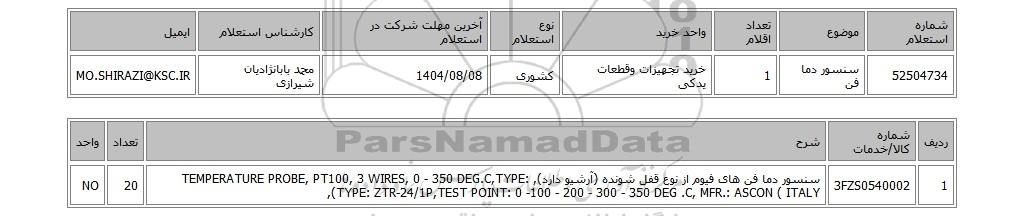 | 52504734 | سنسور دما فن | 1 | خرید تجهیزات وقطعات یدکی | کشوری | 1404/08/08 | محمد بابانژادیان شیرازی | MO.SHIRAZI@KSC.IR |