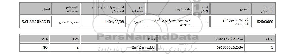 | 52503680 | نگهداری تعمیرات و تاسیسات | 1 | خرید مواد مصرفی و اقلام عمومی | کشوری | 1404/08/08 | سعید شمس | S.SHAMS@KSC.IR |