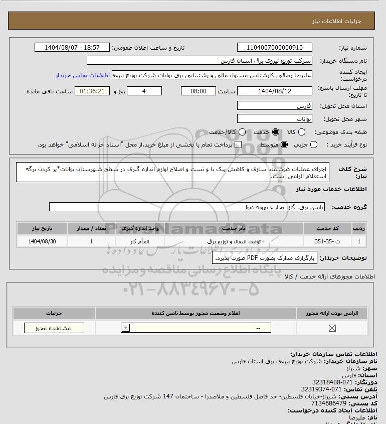شرح کلی نیاز: اجرای عملیات هوشمند سازی و کاهش پیک با و تست و اصلاح لوازم اندازه گیری در سطح شهرستان بوانات*پر کردن برگه استعلام الزامی است.