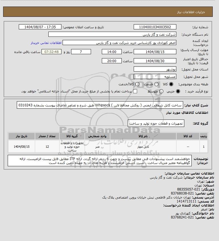 شرح کلی نیاز: ساخت کابل شلاقی ایمنی ( روکش محافظ لاین ) Whipsock طبق شرح و تصاویر تقاضای پیوست بشماره 0310243