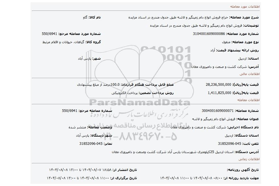| نام دستگاه اجرایی: شرکت کشت و صنعت و دامپروری مغان | وضعیت معامله: منتشر شده | |