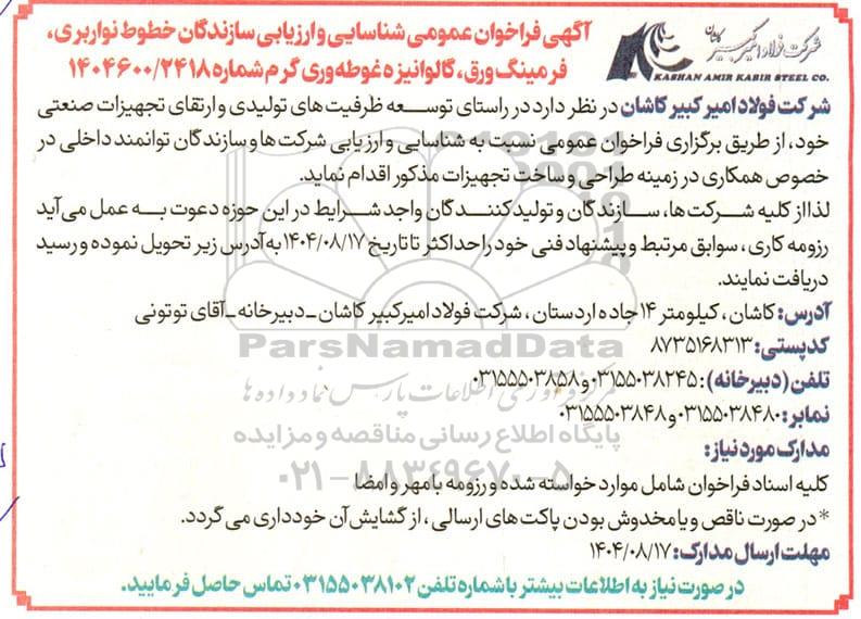 آگهی فراخوان عمومی شناسایی و ارزیابی سازندگان خطوط نواربری، فرمینگ ورق، گالوانیزه غوطه وری گرم شماره 1404600/2418