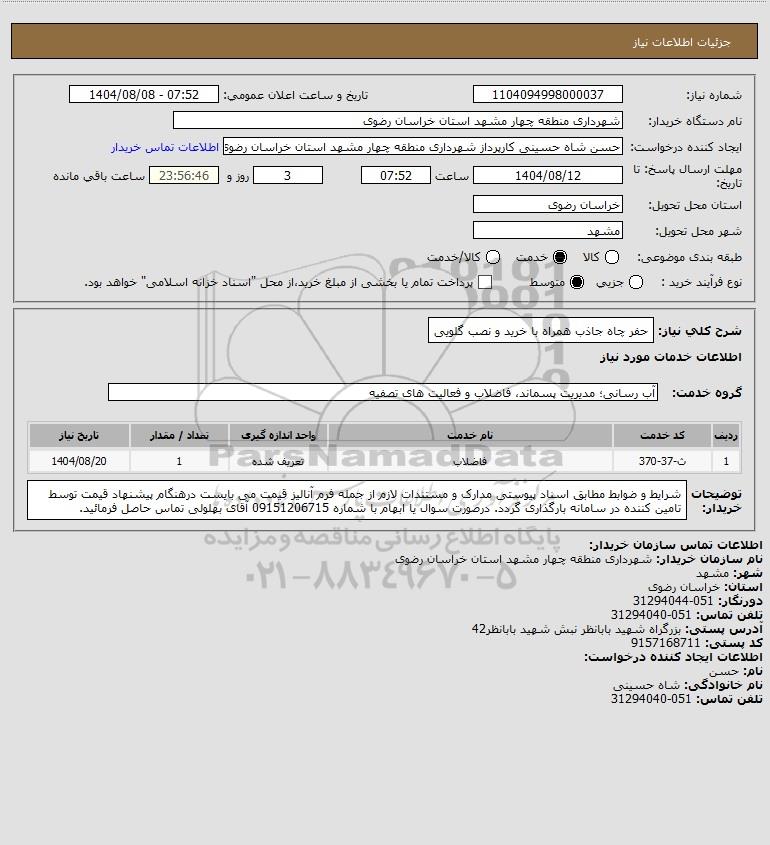 شرح کلی نیاز: حفر چاه جاذب همراه با خرید و نصب گلویی