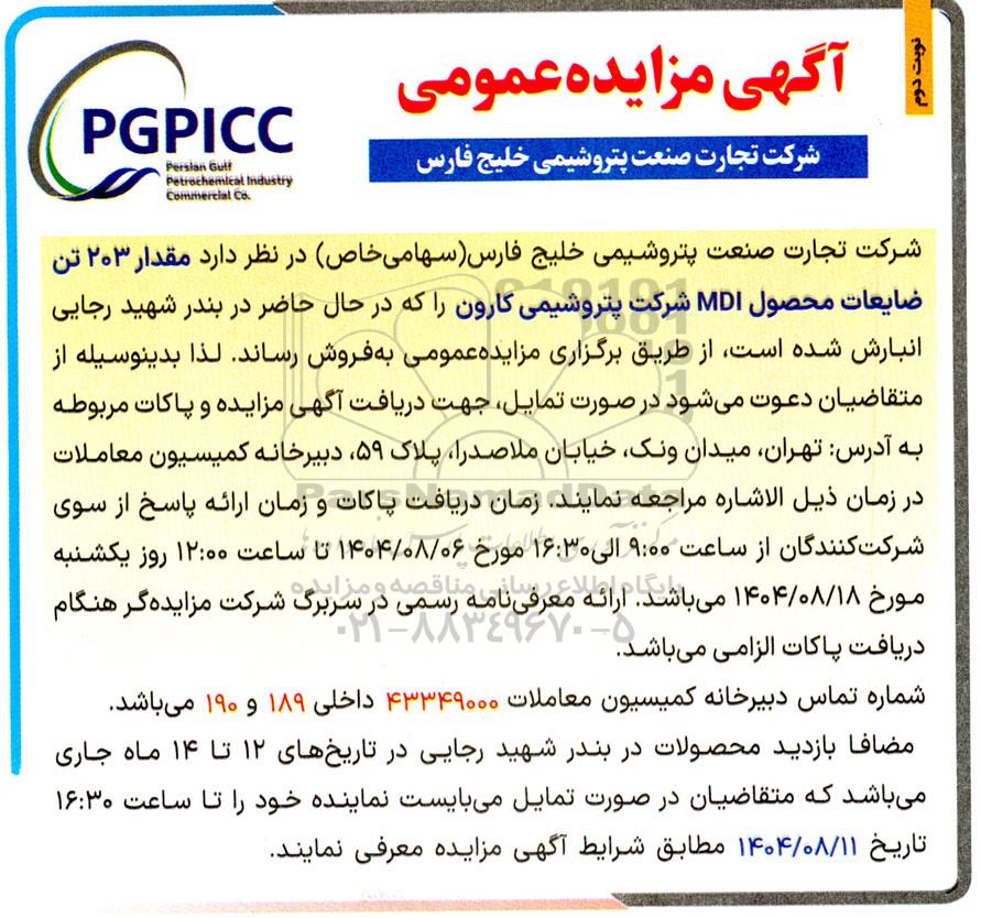 شرکت تجارت صنعت پتروشیمی خلیج فارس (سهامی خاص) در نظر دارد مقدار 203 تن ضایعات محصول MDI شرکت پتروشیمی کارون را که در حال حاضر در بندر شهید رجایی انبارش شده است از طریق برگزاری مزایده عمومی به فروش رساند. لذا بدینوسیله از متقاضیان دعوت میشود در صورت تمایل جهت دریافت آگهی مزایده و پاکات مربوطه به آدرس تهران، میدان ونک، خیابان ملاصدرا، پلاک 59، دبیرخانه کمیسیون معاملات در زمان ذيل الاشاره مراجعه نمایند زمان دریافت پاکات و زمان ارائه پاسخ از سوی شرکت کنندگان از ساعت 9:00 الی 16:30 مورخ 1404.08.06 تا ساعت 12:00 روز یکشنبه مورخ 1404.08.18 میباشد. ارائه معرفی نامه رسمی در سربرگ شرکت مزایده گر هنگام دریافت پاکات الزامی میباشد.
