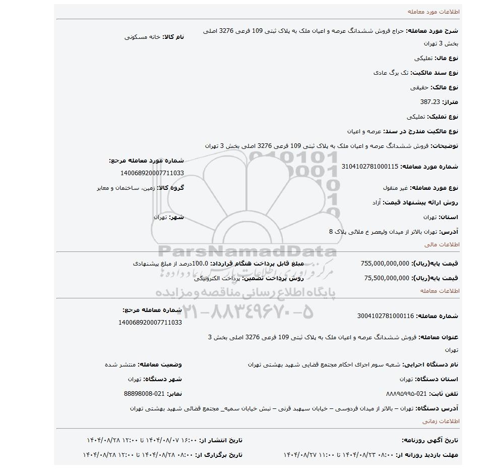 | شرح مورد معامله: حراج فروش ششدانگ عرصه و اعیان ملک به پلاک ثبتی 109 فرعی 3276 اصلی بخش 3 تهران | نام کالا: خانه مسکونی | |
