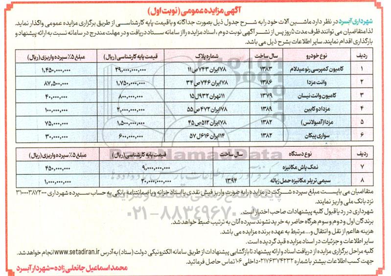 شهرداری آبسرد در نظر دارد ماشین آلات خود را به شرح جدول ذیل بصورت جداگانه و با قیمت پایه کارشناسی از طریق برگزاری مزایده عمومی واگذار نماید. لذا متقاضیان می توانند ظرف مدت 5 روز پس از نشر آگهی نوبت دوم اسناد مزایده را از سامانه ستاد دریافت و در مهلت مندرج در سامانه نسبت به ارائه پیشنهاد و بارگذاری اقدام نمایند. سایر اطلاعات بشرح ذیل می باشد.