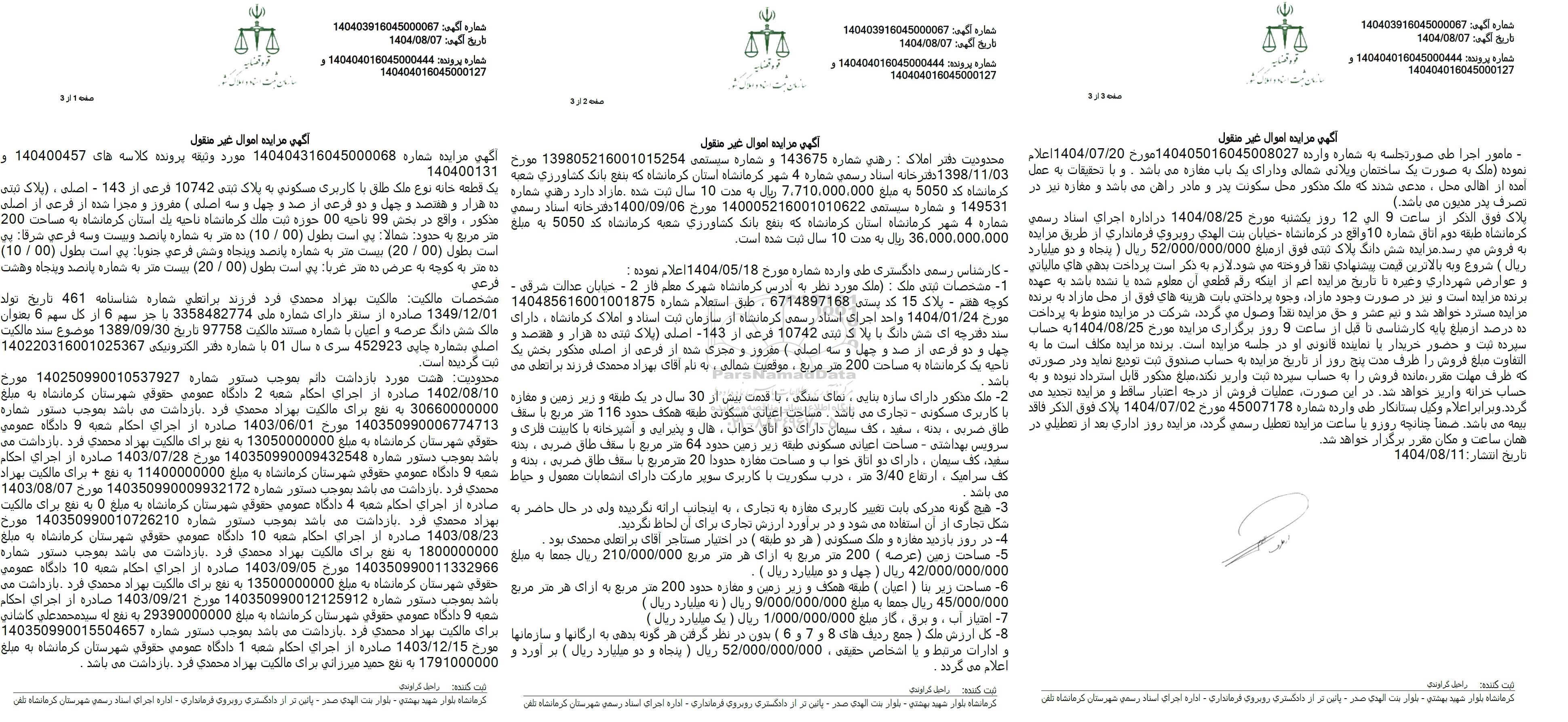 مشخصات مالکیت مالكیت بهزاد محمدی فرد فرزند برانعلی شماره شناسنامه 461 تاریخ تولد م 6 از کل سهم 6 بعنوان 1349.12.01 صادره از سفر دارای شماره على 3358482774 با 159097 مالک شش دانگ عرصه و اعیان با شماره هستند مالکیت 97758 . موضوع سند مالکیت اصلی بشماره جایی 452923 سرکه سال 01 با شماره دفتر الکترونیکی 140220316001025367 1389.09.30 تاریخ محدودیت هست مورد بازداشت دائم بموجب ستور شماره 140250990010537927 مورخ 1402.08.10 صادره از جرای احكام شعبه 2 دادگاه عمومی حقوقی شهرستان کرمانشاه به مع 30660000000 به نفع برای مالکیت بهزاد محمدی فرد بازداشت می باشد بموجب دستور شماره 140350990006774713 مورخ 1403.06.01 صادره از اجرای احکام شعبه و دادگاه عمودی حقوقی شهرستان کرمانشاه به مبلغ 13050000000 به نفع برای مالکیت بهزاد محمدی فرد . بازداشت می باشد بموجب دستور شماره 140350000009432548 مورخ 1403.07.28 صادره از اجرای احکام شعبه و دادگاه عمومی حقوقی شهرستان کرمانشاه به مبلغ 11400000000 به نفع ، برای مالکیت بهزاد محمدی فرد بازداشت می باشد بموجب دستور شماره 140350990009932172 مورخ 1403.08.07 08.07 مورخ صادره از اجرای احکام شعبه به دادگاه عمود عمومی حقوقی شهرستان کرمانشاه به مبلغ 0 به نفع برای مالکیت 1403.08.23 صادره از اجرای احکام شعبه 10 دادگاه عمومی حقوقی شهرستان کرمانشاه به صبح1800000000 به نفع برای مالکیت بهراد محمدی فرد فرد بازداشت می می باشد باشد بموجب بموجب دستور شماره بهزاد محمدی فرد بازداشت باشد بموجب دستور شماره 140350990010726210 مورج140350990011332966 مورخ 1403.09.05 صادره از اجرای احکام شعبه 10 دادگاه عمو حقوقی شهرستان کرمانشاه به مبلغ 13500000000 به نفع برای ماکیت بهزاد محمدی فرد . بازداشت می باشد بموجب دستور شماره 140350990012125912 مورخ 1403:09.21 صادره از اجرای احکام همه و دادگاه عمومی حقوقی شهرستان کرمانشاه به مبلغ 29390000000 به نفع له سند محمد علی کاشانی140350990015504657 ماره برای مالکیت بهزاد محمدی فرد بازداشت می باشد بموجب دستور شماره مورخ 1403.12.15 صادره از اجرای احکام شعبه 1 دادگاه عمومی حقوقی شهرستان کرمانشاه به صبح1791000000 به نفع حمد میرزانی بری مالکیت بهزاد محمدی فرد . بازداشت می باشد.